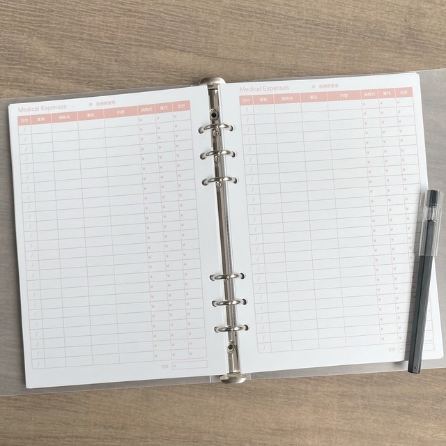 A5サイズの医療費管理表(システム手帳用のリフィル)です。 ピンクの可愛い色合いです。 茶系はこちら→ https://hitotose.kawaiishop.jp/items/64363067 「年」「日付」「家族の名前」「病院名」「薬名」「内容(症状など)」「病院代」「薬代」「合計金額」を記入できます。 1年間に10万円以上の医療費を支払うと医療費控除を受けることができ、税金の一部が戻ってくることがあるので、医療費管理表を使って管理するのがおすすめです。 どんな症状の時にどれくらい支払ったかを確認するのにも重宝します。 【内容】 A5サイズ 両面印刷12枚入 【穴あけについて】 ・6穴 ・20穴 ・穴なし からお選びいただけます。オプションでご選択ください。 【発送について】 通常1日〜3日で発送いたします。 年末年始やゴールデンウィークなど連休をはさむ場合は、7日ほどかかることがございます。 【用紙について】 一般的なコピー用紙(70kg)よりも厚めで、筆記性に優れた上質紙(90kg)を使用しています。 インクジェットプリンターで印刷しています。 【その他注意点】 写真に写っているバインダーとペンは付属しておりません。 画像は出来るだけ実物に近いものを心掛けていますが、実際の色と多少異なる場合がございます。 ーーーーーー バレットジャーナル 手帳 家計簿 ルーズリーフ