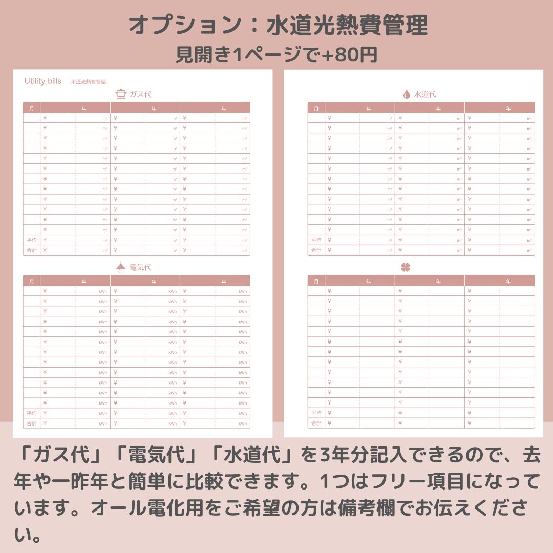 ※水道光熱費管理のオール電化用は、左ページに電気代、水道代、右ページにフリー項目が2つになります。