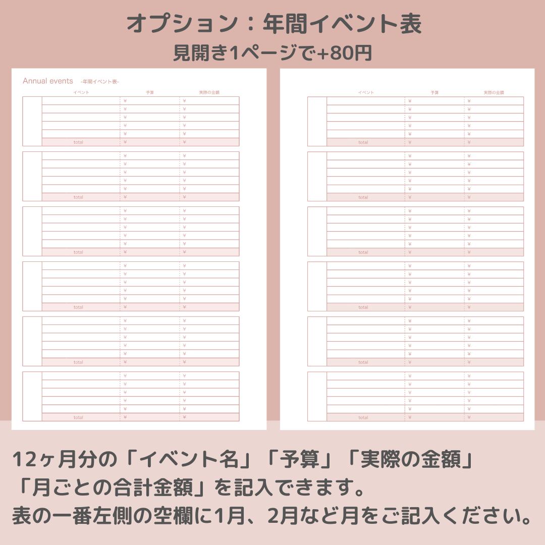 オプションでご希望の枚数をご選択いただき、備考欄に「年間イベント表」などのオプション名をご記入ください。