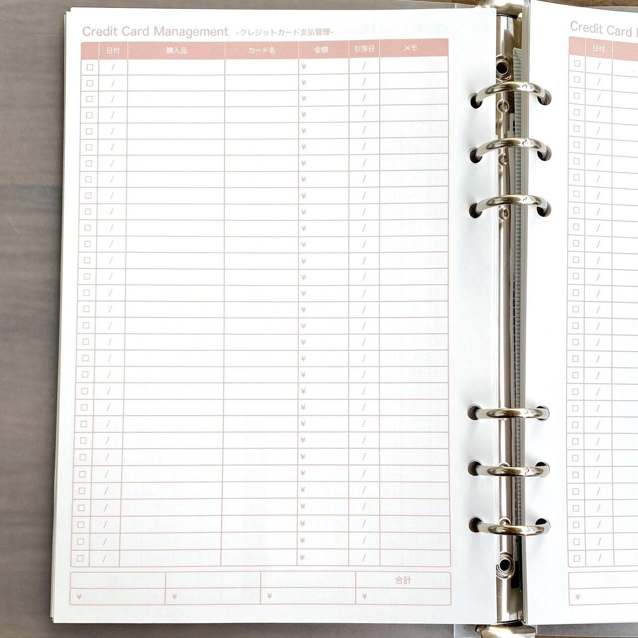 A5サイズのクレジットカード支払管理表(システム手帳用リフィル)です。